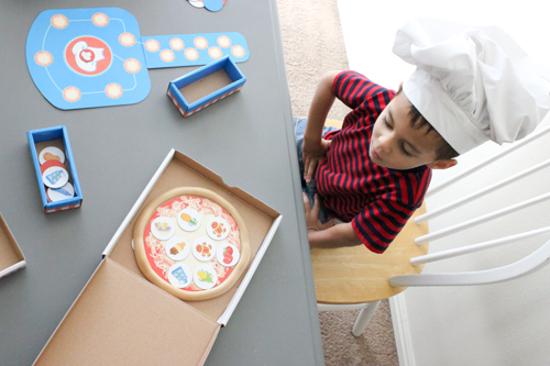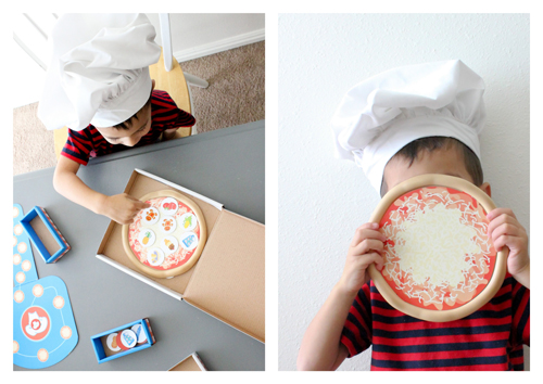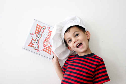 My middle son, Reid, LOVES to play this obscure pizza listening game we have, at least once a week and his "favwrit" food also happens to be pizza. So, when trying to think up something fun for this dress up series, a pizza chef's hat seemed like the perfect choice.